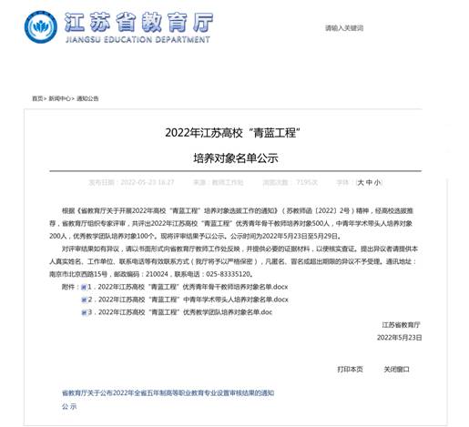 “青蓝工程”是省教育厅为实施科教兴省和人才强省战略,进一步加强师资队伍建设,培养优秀青年骨干教师、中青年学术带头人和优秀教学团队而实施的重要人才工程。截至目前,我院共有2人入选优秀青年骨干教师培养对象,2人入选中青年学术带头人培养对象,1个团队入选优秀教学团队培养对象。