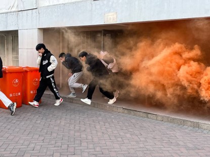 公开课结束后,全体人员在学生宿舍27号楼进行了消防实地演练。学校保卫处负责同志现场讲解了灭火器的构造、使用方法及注意事项等,并指导师生代表进行实践操作。