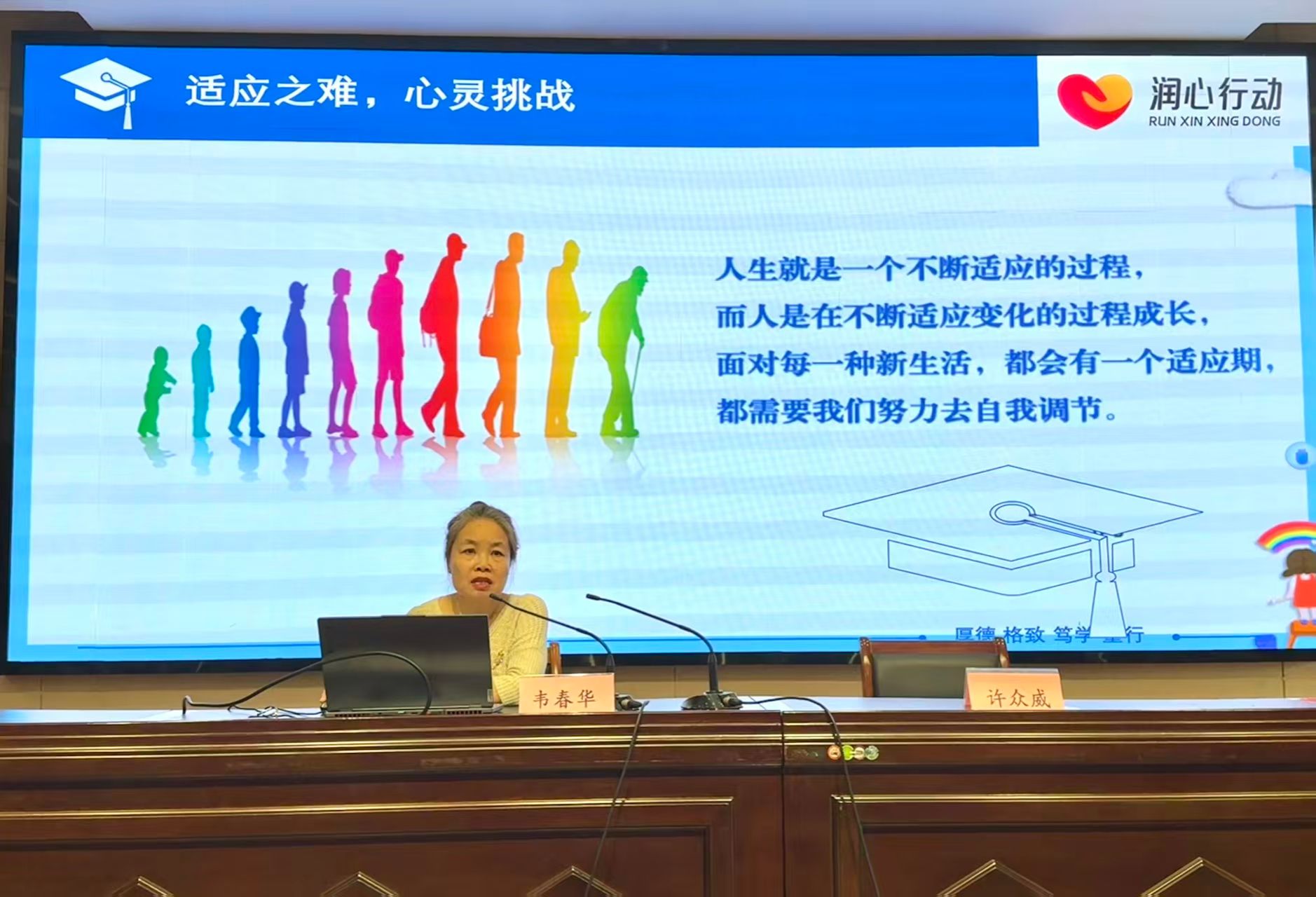 韦春华以“适应”为关键词,从“适应之难,心灵挑战”、“调适有方,守护心灵”等方面展开阐述。她指出“适应”是一种与环境融洽和谐的关系,人生就是不断适应的过程,大一新生在适应生活、人际、学习方面面临着挑战。针对这些挑战,韦春华建议同学们要培养积极心态,接纳自己的不完美并且要正确看待挫折。她结合大一新生的身心状况强调了调适的方法:一是正确评价自我,重新角色定位;二是调整人际关系,寻求外部支持;三是确定奋斗目标,做好生涯规划。她鼓励新生正确认识自己的负面情绪,塑造积极向上的心态,勇敢地寻求心理支持,从而拥有一段充实且美好的大学时光。