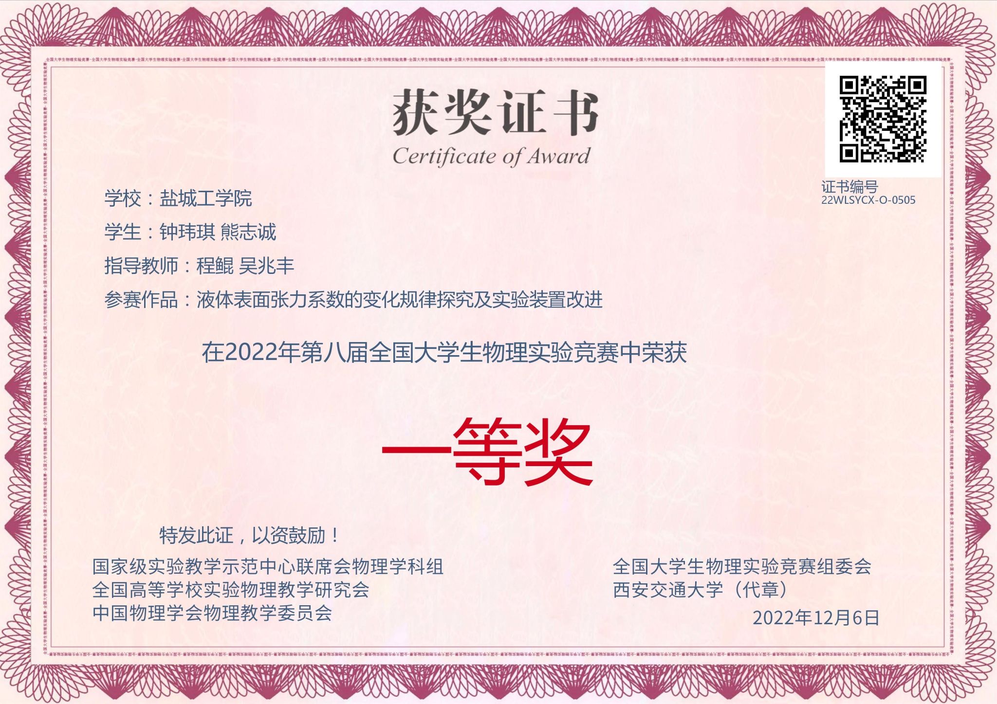 经过决赛的激烈角逐,我校参赛的5支队伍全部获奖。其中,由程鲲老师、吴兆丰老师指导的作品《液体表面张力系数的变化规律探究及实验装置改进》取得了“自选类”竞赛国家一等奖。由吴锋老师、殷长荣老师指导的作品《线胀系数测量》取得了“讲课类”竞赛国家一等奖。