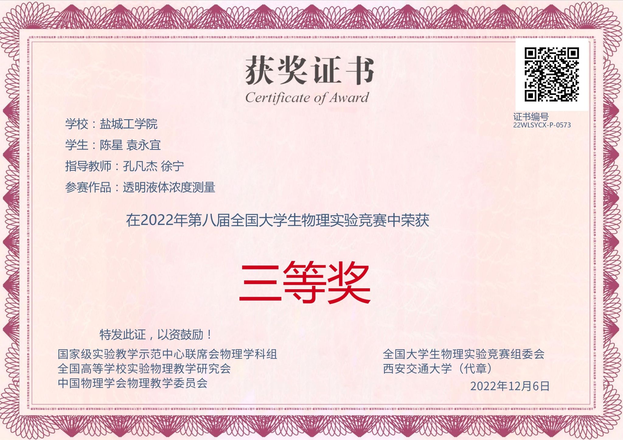 近日,2022年第八届全国大学生物理实验竞赛(创新赛)比赛结果揭晓,我校学子喜获一等奖2项,二等奖1项,三等奖2项。盐城工学院获本次竞赛的优秀组织奖。