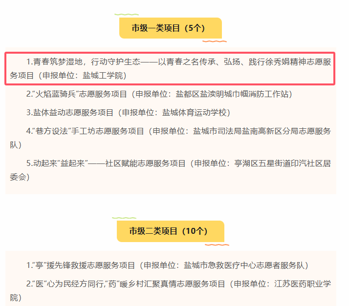 近日,中共盐城市委社会工作部正式公布2025年度盐城市新时代志愿服务市级项目终评结果,我院申报的《青春筑梦湿地,行动守护生态——以青春之名传承、弘扬、践行徐秀娟精神》志愿服务项目,从众多参评项目中脱颖而出,获评“市级一类项目”第一名。这是我院志愿服务工作取得的又一项重要荣誉,标志着项目品牌化建设迈上新台阶。